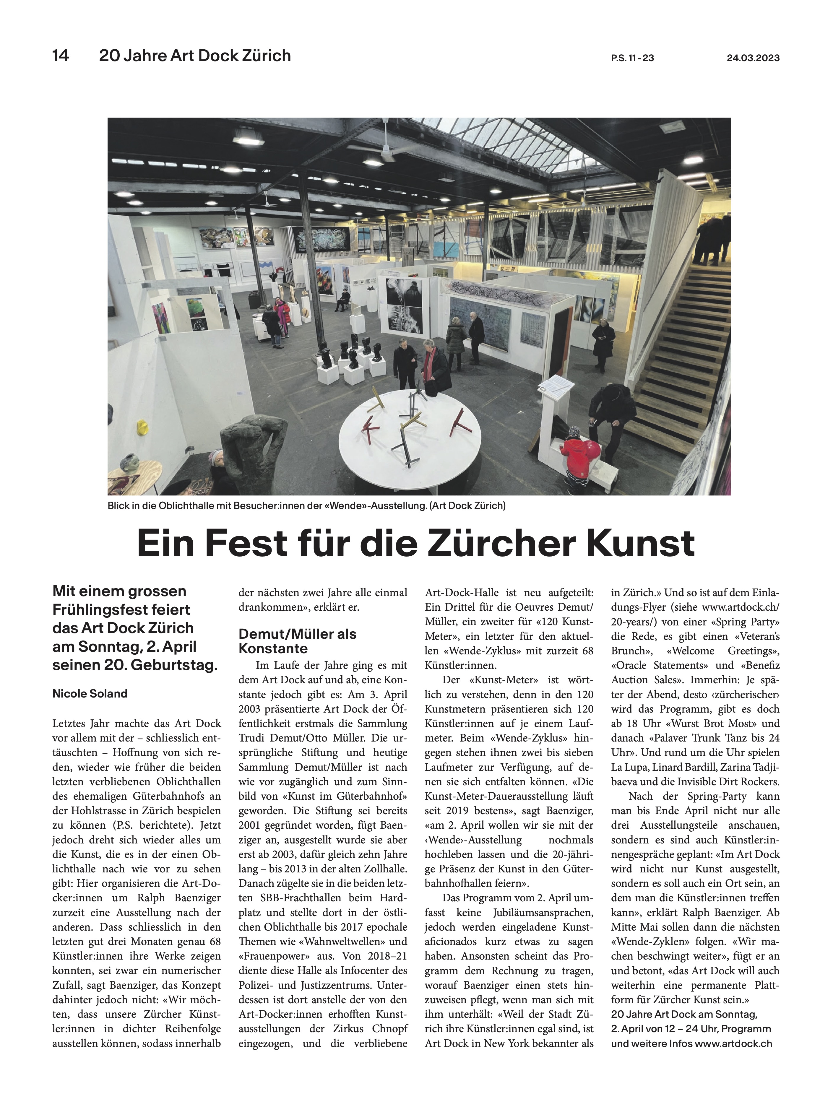 NZZ-Artikel zu Benazzi&Stocker NZZ-Artikel zur Frauenpower NZZ-Artikel zu den WahnWeltWellen Blog "Nochmals mit Karacho" (betr. Kunstmeter) NZZ-Artikel - ArtDock kann bleiben ps-Artikel zur Zirkusbarrage 1 ps-Artikel zur Zirkusbarrage 2 ps-Artikel zur Ausstellung Wende 23 ps-Artikel zur Ausstellung (Impulse-Hertbst-24) ps-Artikel zum Protest-Fest (Impulse-Herbst-24) |